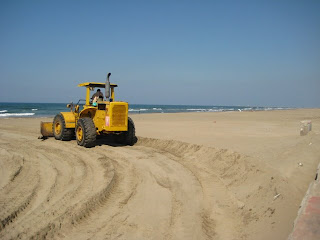 Cette fin-de-semaine, en ville là où on héberge le prestigieux siège social de la CiePEMEX , où on accueille une convention importante de délégations venues de tous les états (42) mexicains, il faudra faire vite. On décide d'enfouir tous les déchets et de nettoyer la plage le long du grand boulevard...avec les grand moyens.